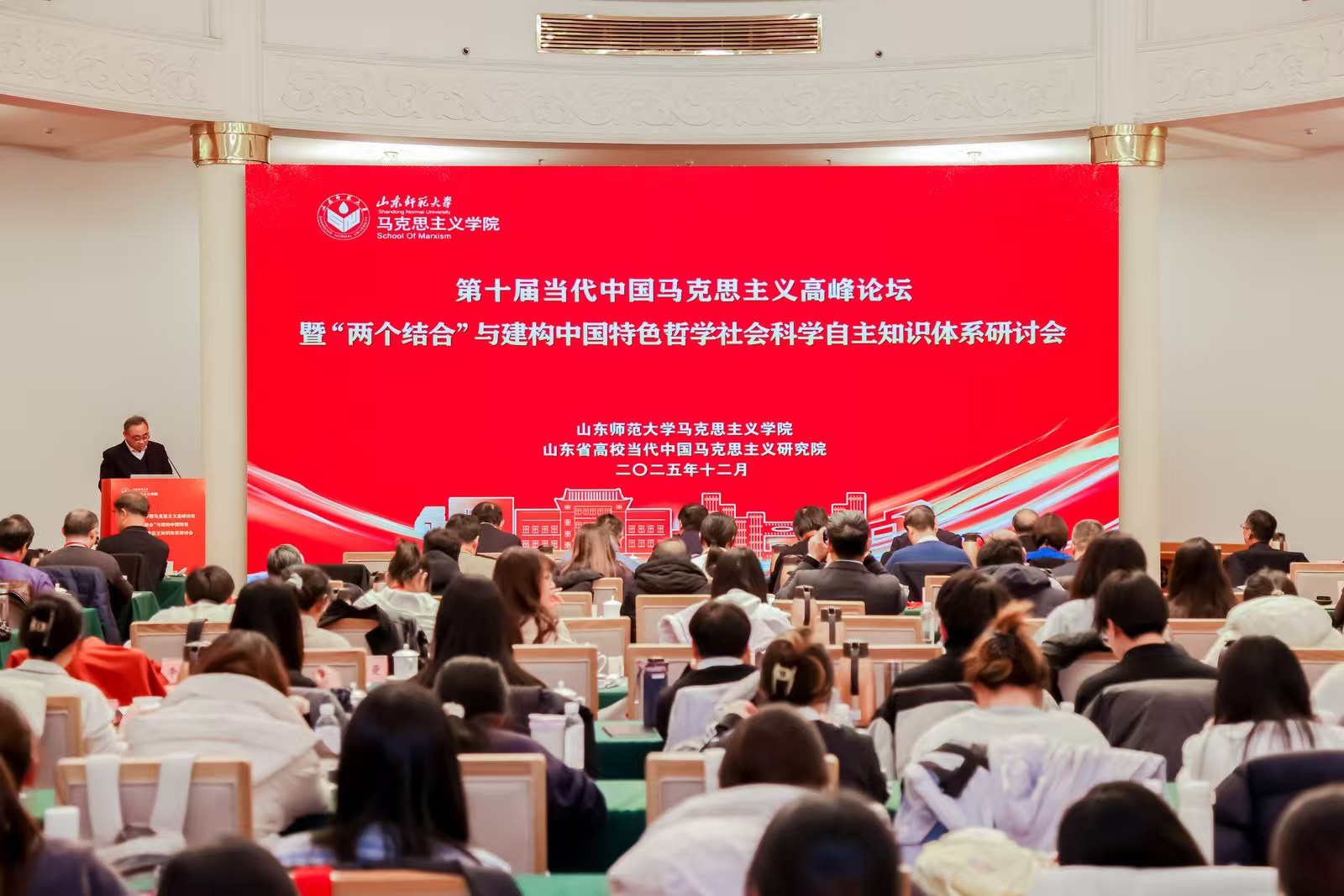 2025年12月14日,第十届当代中国马克思主义高峰论坛暨“两个结合”与建构中国特色哲学社会科学自主知识体系研讨会在济南召开。来自北京大学、清华大学、中国人民大学、复旦大学、吉林大学、山东大学、北京师范大学、西安交通大学、东北师范大学、南京师范大学、湘潭大学、浙江大学、中国石油大学(华东)、大连理工大学、山东师范大学等80多所高校、社科院、党校的专家学者及学生,共计200多人参加会议。
