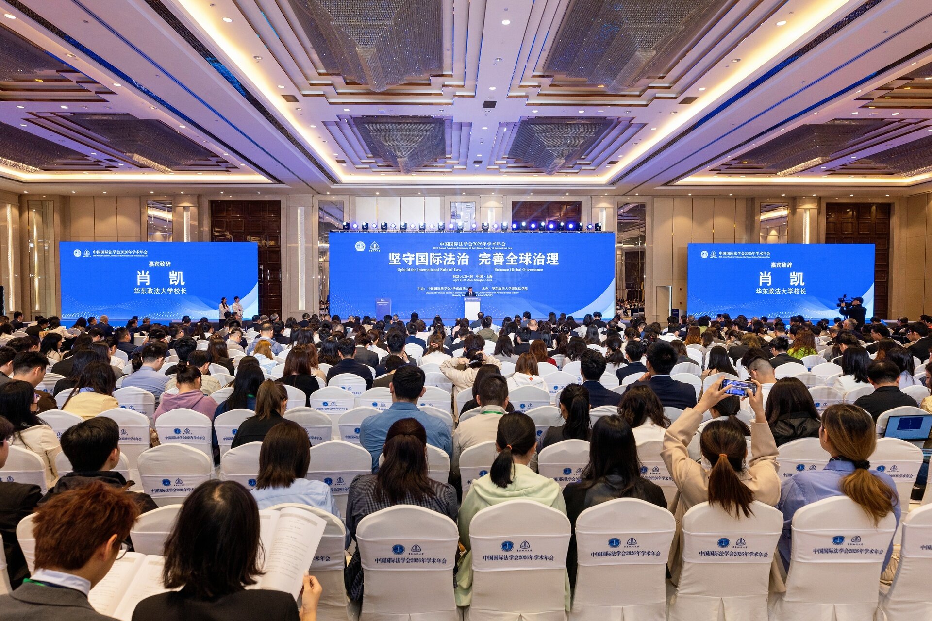 4月24—26日,中国国际法学会2026年学术年会在上海举行。本届年会以“坚守国际法治,完善全球治理”为主题,围绕“以正确的国际法观坚定维护战后国际秩序”主线,聚焦涉外法治、全球治理、国际争端解决、新兴领域法治等重大议题展开研讨。会议由中国国际法学会与华东政法大学主办,华东政法大学国际法学院承办。来自全国高等院校、科研机构、政府部门、司法实务界、法律服务行业的专家学者、实务工作者及青年学生等1500余人参会。
